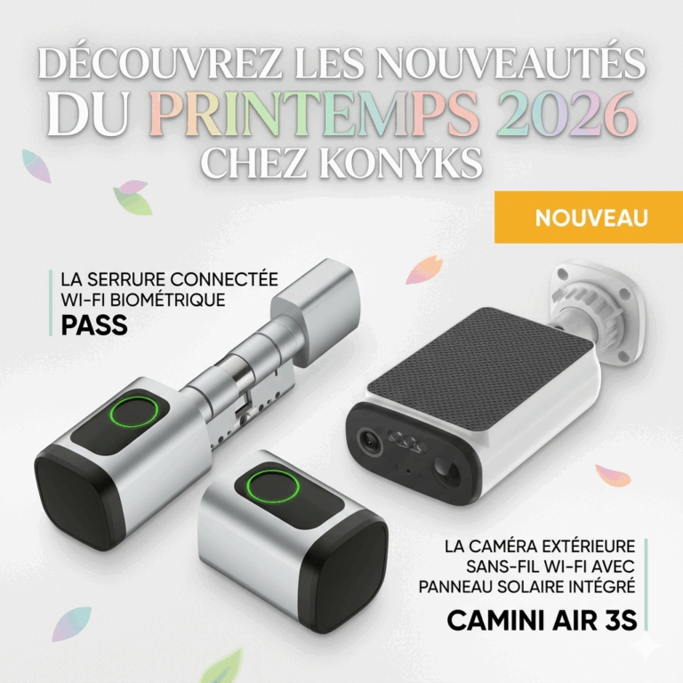 Heureusement, Konyks fait une promesse : vous offrir, via des objets connectés, le pouvoir de contrôler votre maison, de manière sûre et simple. Après le succès fulgurant de sa première nouveauté de l’année 2026 : la Camini AIR S360, puis de sa sonnette connectée DRINGG, Konyks vous fait découvrir deux nouveautés : une nouvelle caméra extérieure et la serrure connectée Wi-Fi biométrique.