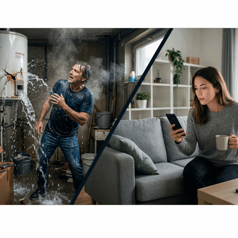 La femme à droite, elle, a simplement reçu une notification. Elle a posé son café, a coupé l'arrivée d'eau générale, et a appelé un plombier pour un simple changement de joint à 50 €. Sa journée a continué normalement.