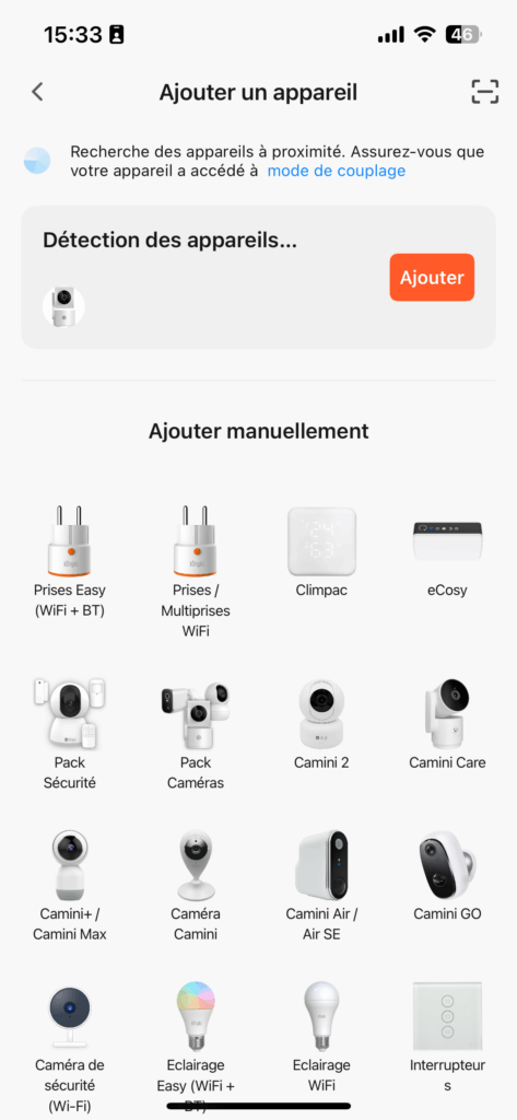 Sélectionnez "Pack caméra" dans la liste des appareils à ajouter