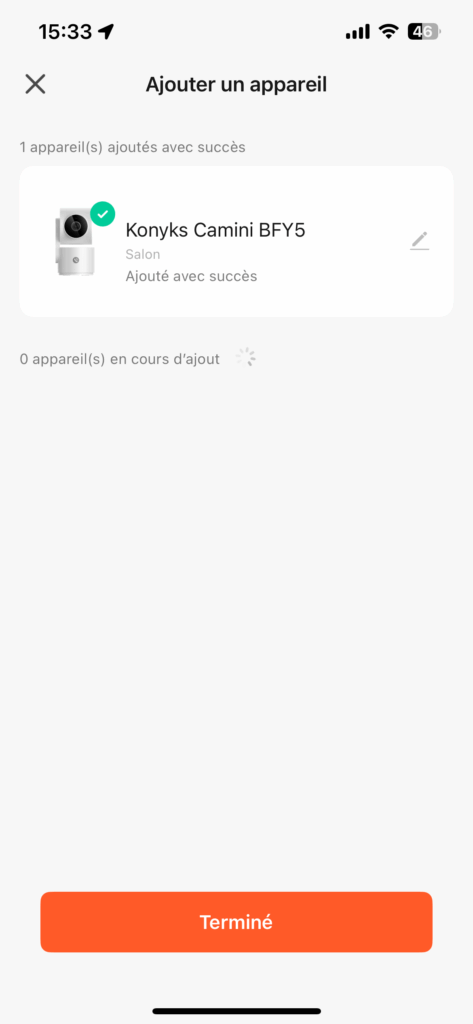 Un indicateur de progression s’affiche, lorsqu’il atteindra 100%, l’appareil aura été ajouté avec succès :