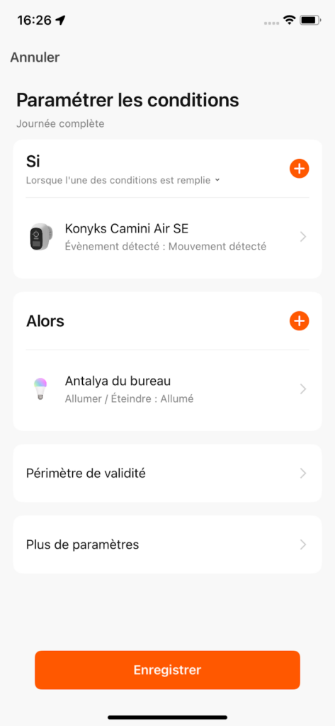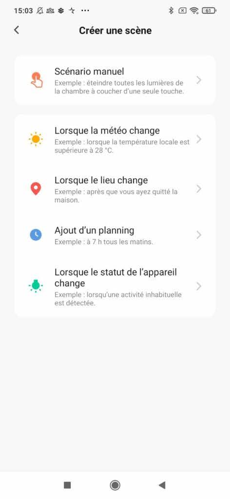 Dans l’onglet scénario, appuyez sur le + en haut à droite et choisissez lorsque le statut de l’appareil change.