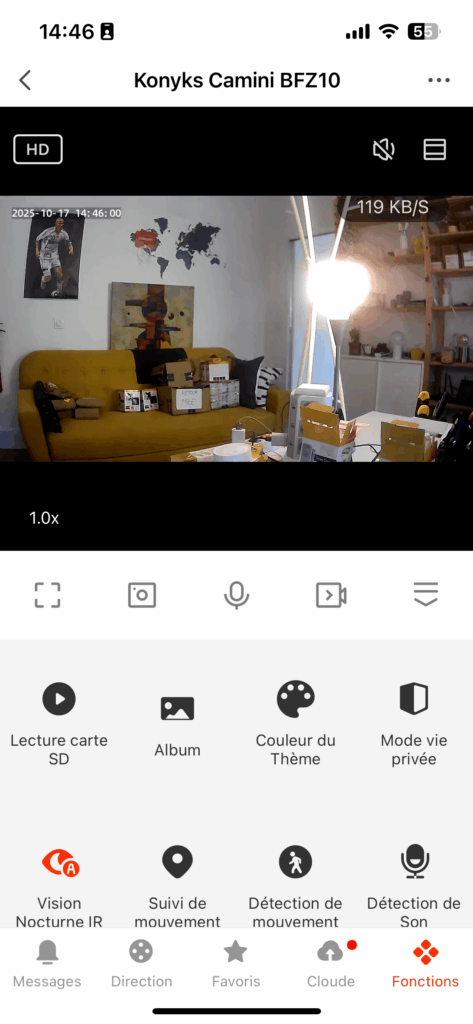 La carte micro SD (128 GB max) s’installe sous l'objectif de la Camini BFZ10, vous pouvez lever l'œil de la caméra grâce aux flèches directionnelles dans l’app.
