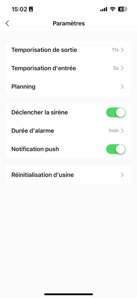 Durée de la sirène : réglable selon vos préférences. Par défaut, la sirène retentit un certain temps après déclenchement.