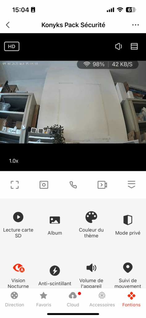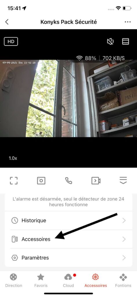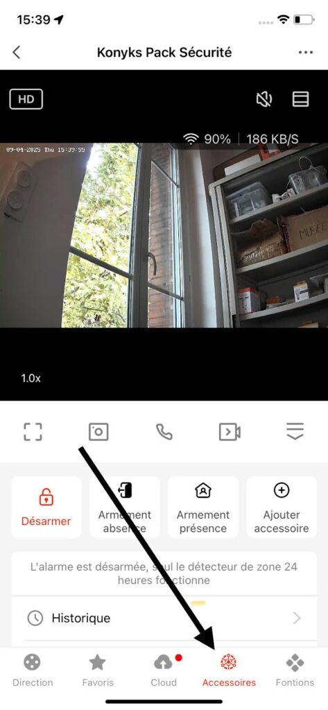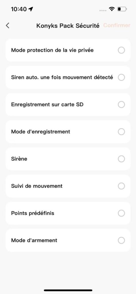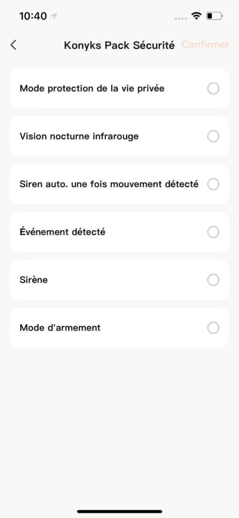 La caméra du Pack Sécurité Konyks fait office de hub central et intègre une alarme complète. Important : les accessoires du pack (télécommandes, détecteurs d’ouverture et de mouvement) ne fonctionnent qu’avec l’alarme. Ils ne déclenchent aucune action en dehors de ce système.