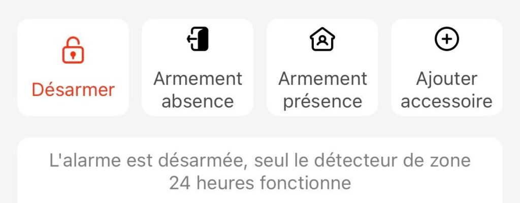 Désarmé L’alarme est inactive. Seuls les détecteurs configurés en “zone 24 heures” restent actifs (ex. détecteurs incendie ou fuite). Ce mode est adapté lorsque vous êtes à la maison et ne souhaitez pas activer la surveillance.
