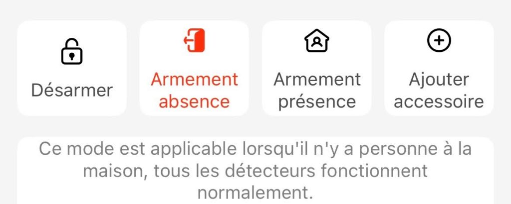 Armement absence Mode à utiliser lorsque personne n’est présent dans le domicile. Tous les détecteurs associés (ouverture et mouvement) sont activés. Pendant le temps d’armement, un court jingle sonore se fait entendre. Si un capteur est déclenché, l’alarme retentit et une notification est envoyée sur votre smartphone.