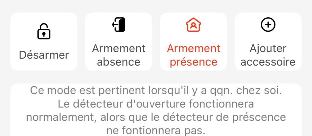 Armement présence Mode à utiliser lorsque quelqu’un est présent dans le logement. Les détecteurs configurés comme “zones maison” (ex. détecteur de mouvement dans le salon) sont désactivés. Les autres détecteurs (portes, fenêtres) restent actifs. Cela permet de circuler dans certaines pièces sans déclencher l’alarme tout en maintenant la sécurité périmétrique.