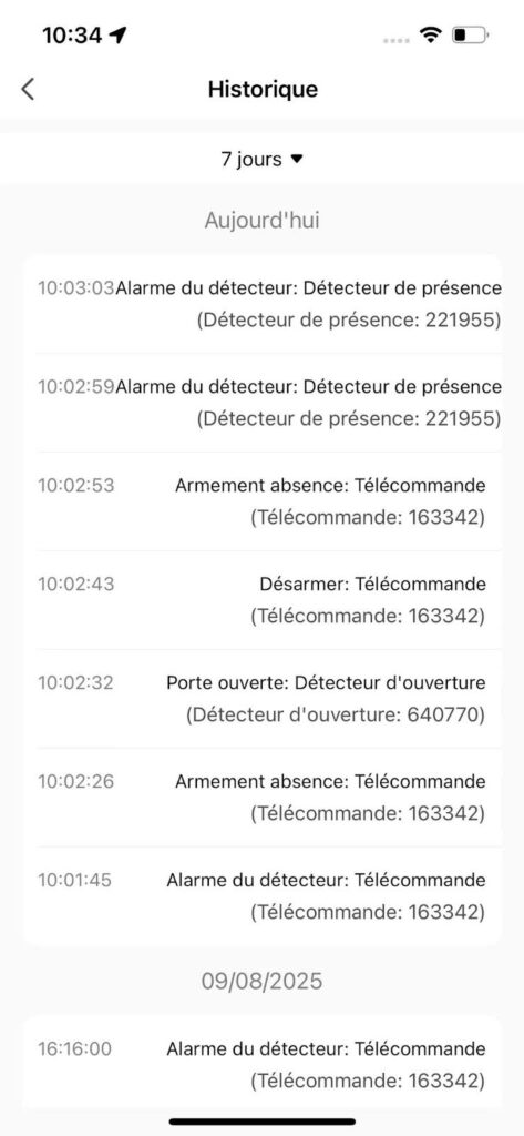 Depuis l’écran principal de l’alarme dans l’application, vous pouvez consulter l’historique.