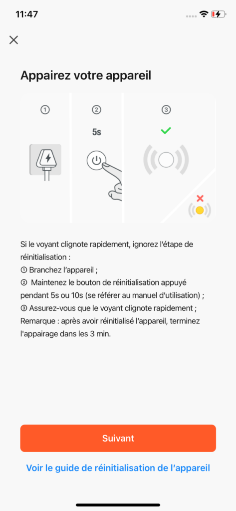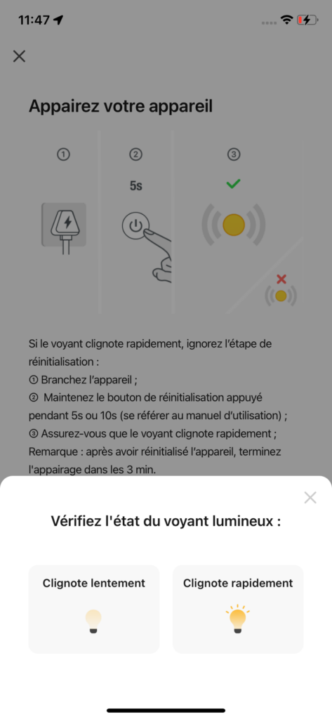 Si la prise ne clignote pas : maintenez appuyé jusqu'à que la prise clignote rapidement (2 clignotements par seconde). Au moment de l'installation votre Smartphone doit être connecté à un réseau Wi-FI 2.4 Ghz uniquement. Si besoin désactivez les réseaux 5 Ghz le temps de l'installation