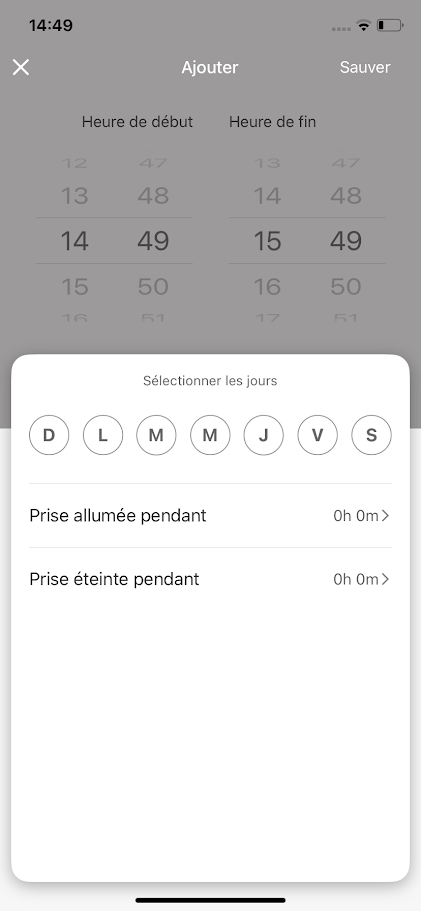 Par exemple, si vous souhaitez que votre prise soit allumée30 m, puis éteinte pendant 30 minutes, puis allumée de nouveau 30 min vous pouvez créer un cycle avec tes temps d'allumages et des temps d'extinctions