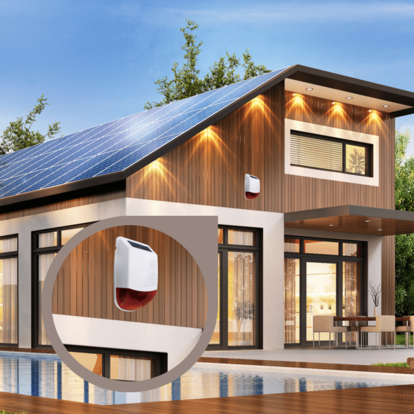 Sirène extérieure solaire avec batterie WOS301S compatible avec la centrale tactile Daewoo Security AM301 et AM302, alarme sonore, avertissement de détection, prévenez une effraction grâce aux notifications d’alerte, protégez votre domicile