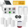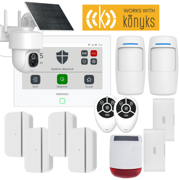 1 centrale tactile + 4 contacteurs de porte + 2 détecteurs de mouvements + 2 détecteurs de vibration WVD301 + 1 sirène extérieure solaire + 2 télécommandes + 1 caméra ext. rotative 4MP avec panneau solaire